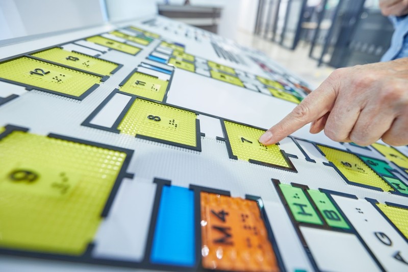 Im Eingangsbereich des Fachgerichtszentrums befindet sich ein taktiler Gebäudegrundriss, der die Lage und Anordnung der durch die Öffentlichkeit nutzbaren Räume im Erdgeschoss wiedergibt. Eine Beschriftung ist sowohl in erhabener Profilschrift als auch in Brailleschrift vorhanden. Durch den taktilen Gebäudegrundriss wiedergegeben werden u.a. die Sitzungssäle (zusätzlich gekennzeichnet durch arabische Ziffern von 1 bis 23), die Mediationsräume (zusätzlich gekennzeichnet als M1, M2, M3 oder M4) und die WCs. Die Herren-WCs sind zusätzlich mit dem Buchstaben H, die Damen-WCs mit dem Buchstaben D und die Behinderten-WCs mit dem Buchstaben B gekennzeichnet. Eine farblich gut erkennbare Gestaltung ermöglicht auch sehbehinderten Besuchern eine einfache und rasche Orientierung.