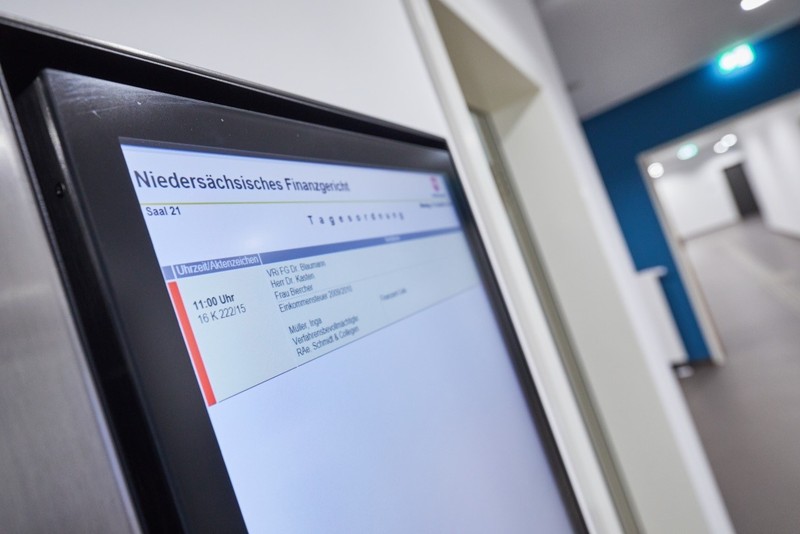 Vor jedem Sitzungssaal befindet sich eine elektronische Saalanzeige (Gerichtstafel) mit Informationen zu den terminierten Verfahren. Die Monitore befinden sich jeweils links von der Tür.