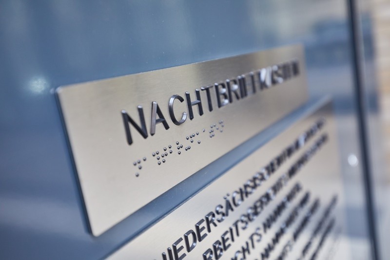 Vor dem Eingang des Fachgerichtszentrums befinden sich 2 Nachtbriefkästen, die taktil beschriftet sind. Sie sind über ein Abzweigefeld im Blindenleitsystem vor dem Eingang des Fachgerichtszentrums erreichbar.